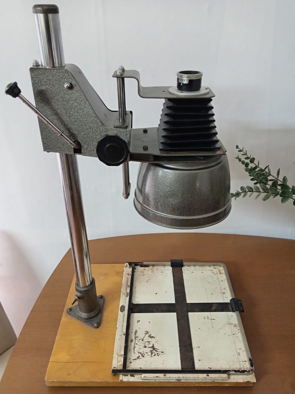 The important thing to note about an enlarger that you might be thinking of getting, is it can be raised or lowered on the column, but won’t begin to slide down once a position has been decided on. Also that it holds the negative flat, and that the illumination is even over the whole of the negative. This last point is difficult to know without seeing it set up in a darkroom. Before you use it, check the wiring is safe.
