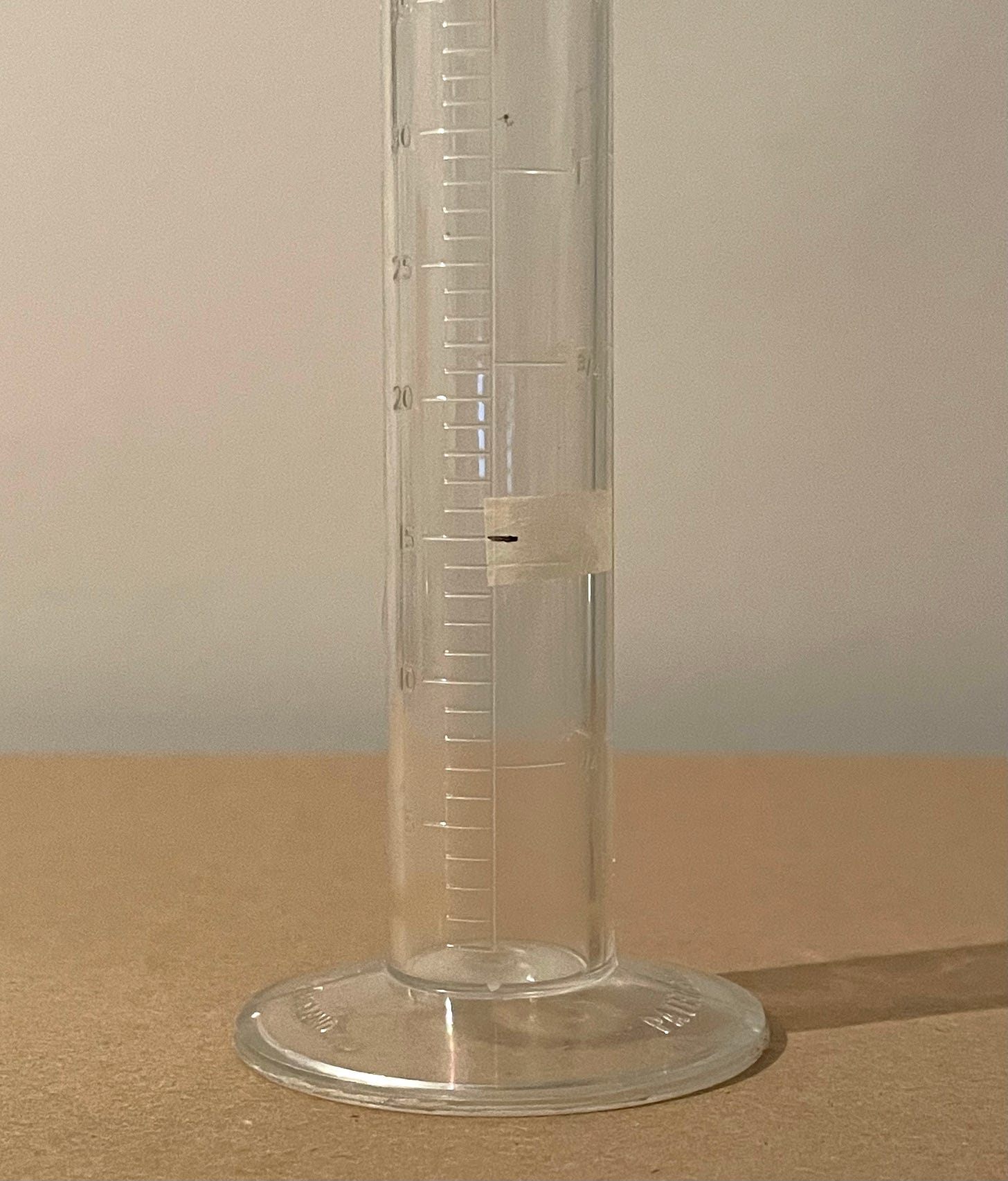 The second method I used was to put a strip of masking tape up the flask next to the numbers and make a black line where I was measuring to. I use a similar technique when measuring out Rodinal concentrate at the small amounts I need for processing one or two rolls of film. With my small measure I aid my vision by putting a small section of tape on it, marking the level I need.