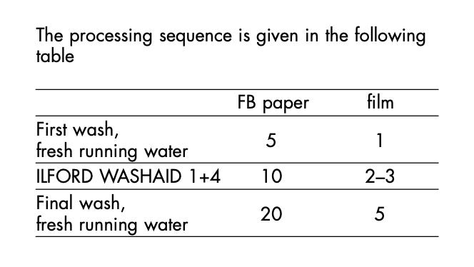 You don’t need any fancy equipment to wash prints, a large tray will do. When your prints are washing it is important to avoid them clinging to each other, as this traps the fix you are trying to wash out. I find that a large tray with a pipe entering from one corner will cause the water to circulate and move the prints round. I also don’t put them all in the same way up, as this encourages them to cling to each other. Alternate them; one face up, the next face down, the next face up and so on. This will cause them to slide over each other better. Change the water a few times too. Resin coated papers wash quickly, but Fibre Based papers need 30 minutes to an hour. Hypo clearing solution can reduce this time, here is the sequence for Ilford’s ‘Washaid’ (in minutes);