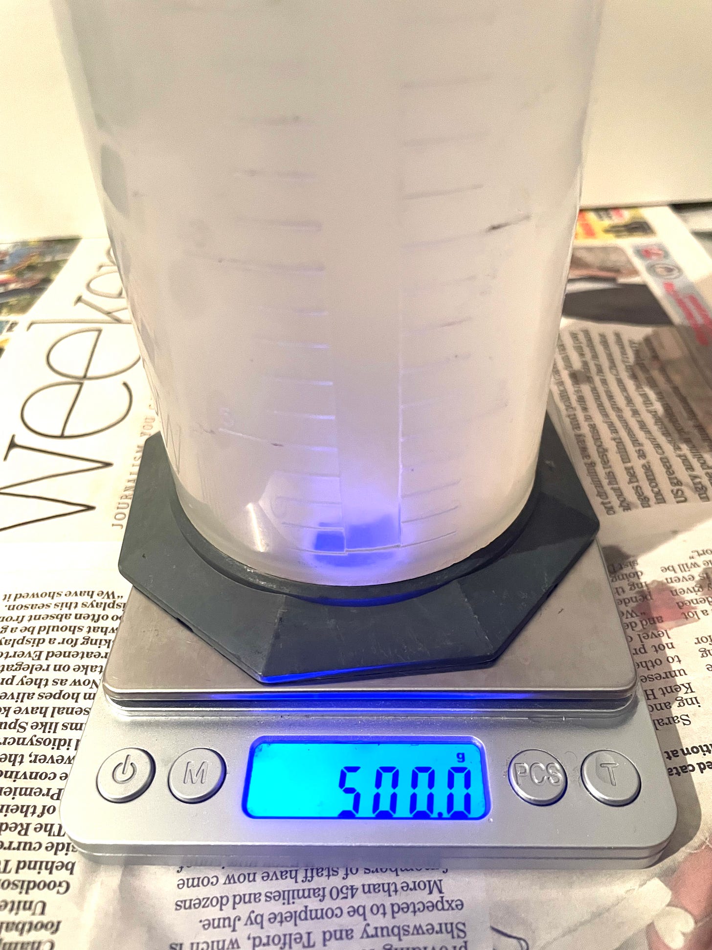 I don’t think it is widely known that when measuring out water (at 20C) the amount in ml is the same as the weight in grams. If you need 350ml of water and you suspect that your measuring flask might not have an accurate scale on the side, you can measure 350 grams instead. Most plastic measures are a bit inaccurate, so I use this method every time. (keep reading, there is a divergence from this rule). I put a clean flask on the scales. I turn the scales on and they set themselves to zero, disregarding the weight of the flask (This can also be done with the ‘tare’ button), then I add the water from a larger jug that I have already got up to temperature.