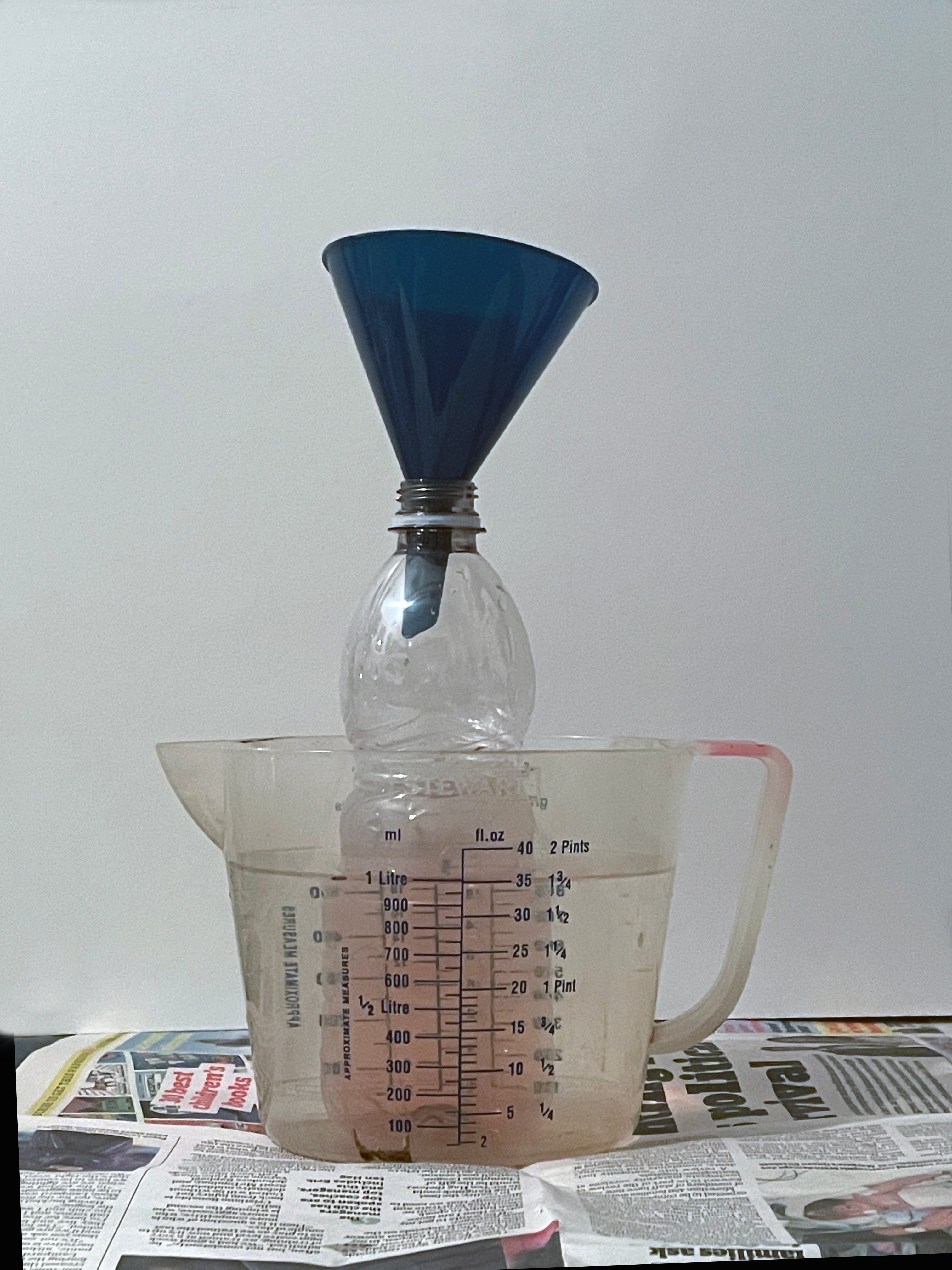 If you use a perspex measuring flask sat in a bath of warmer water you could be waiting a long time as they don’t transmit heat very well. A thinner plastic will transmit heat more rapidly. The thin plastic bottles that you get cheap water in work really well, but don’t cut them down for ease of pouring, because they are too thin to hold their shape when cut in half and your developer will easily spill. Measure out the quantity you will need and pour it into the bottle. Use a small funnel to get into the narrow spout. Because the thin plastic transmits heat quickly, the surrounding water only needs to be about 5 or 10 degrees hotter.