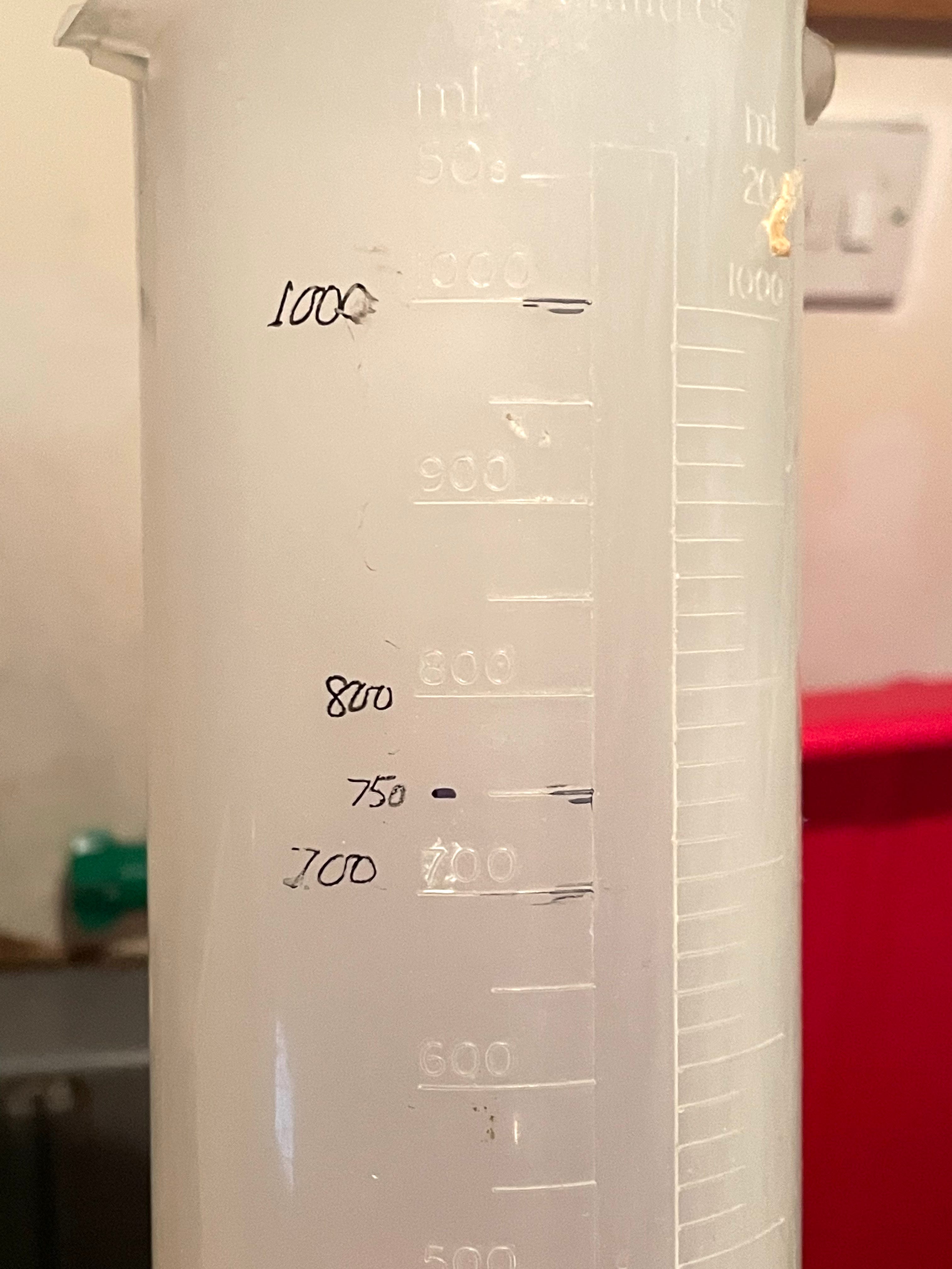 As I have got older I have had the usual deterioration in my ability to see small detail, especially in low light. This means that I have quite a bit of difficulty when measuring out liquids. Measuring flasks are white plastic, or clear, with numbers marked on in relief, difficult to see properly if the flask has water droplets on it. I have a few ways round this; My first method was to lightly rub a permanent marker over the raised numbers for the ones I needed to see. My paper developer is Ilford Multigrade, which mixes at 1+9, therefore I highlight 100ml and 1000ml. I pour the concentrate in up to 100 and top up with water to 1000.