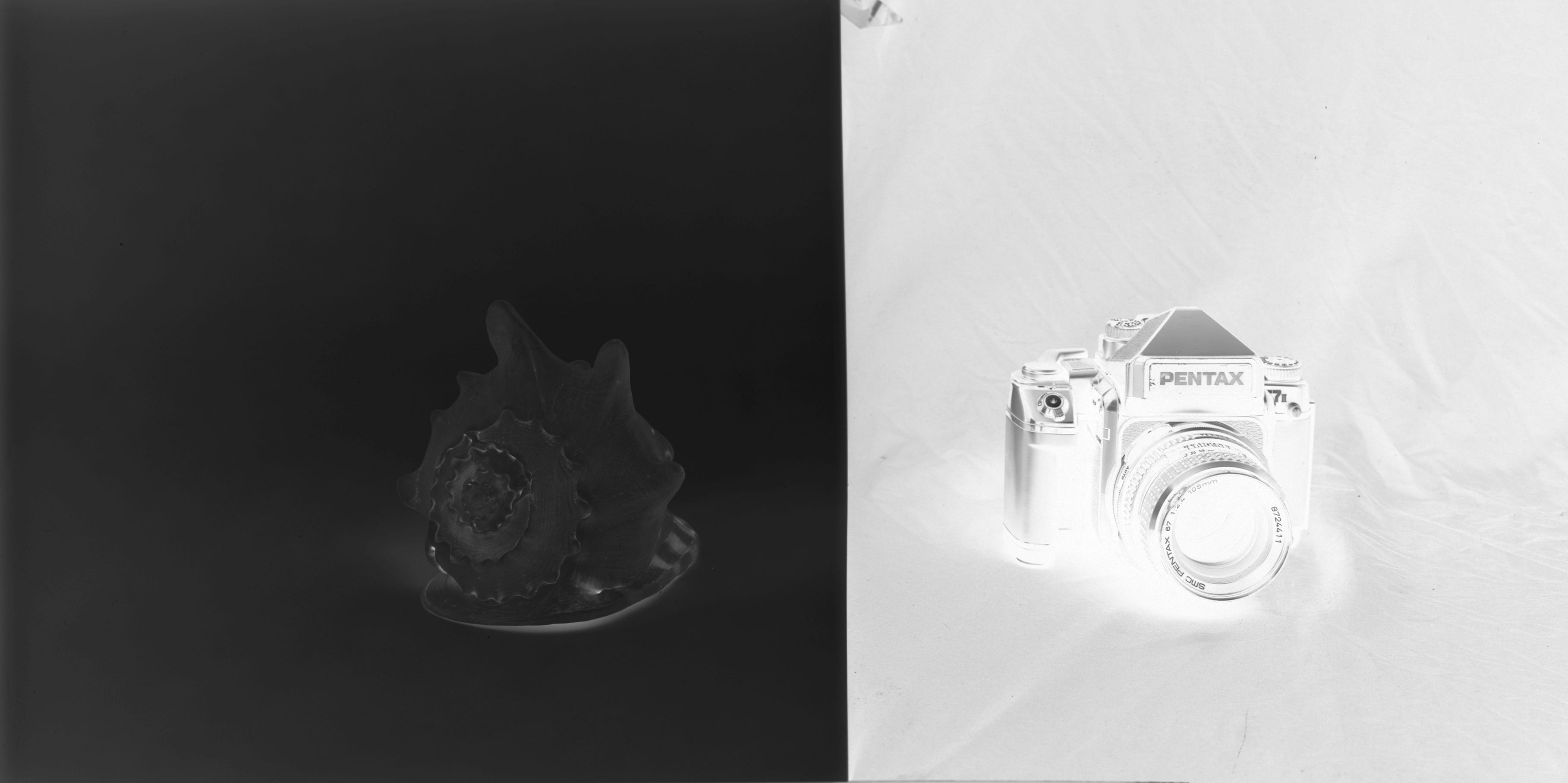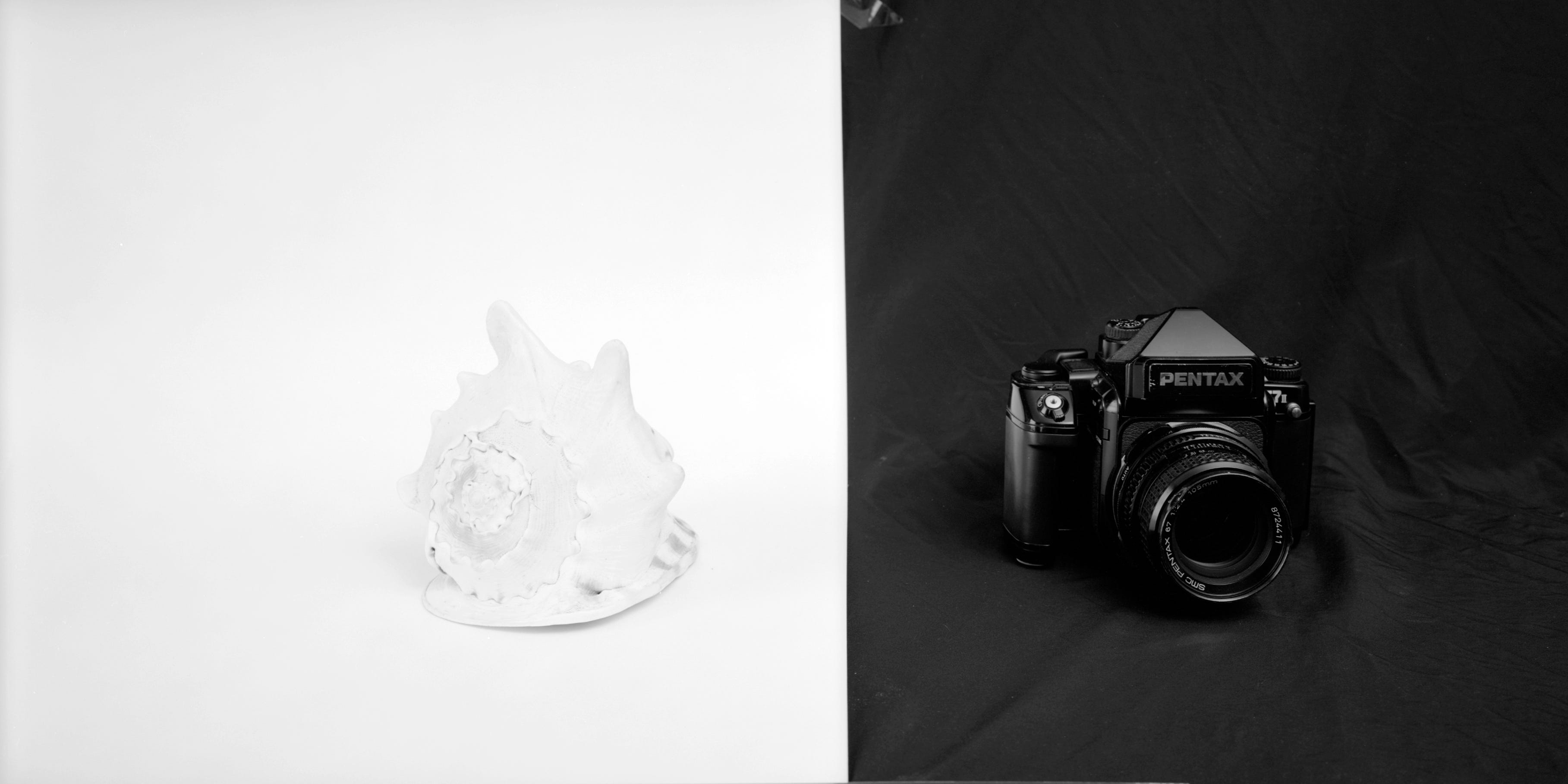 Another illustration might clarify this further; I hung up a black cloth background and taped a sheet of white paper to the left side. On the black part I placed a black camera and on the white part a white shell. I set up my large format camera so that I could get both objects in the frame at once and took an incident meter reading for the available light.
