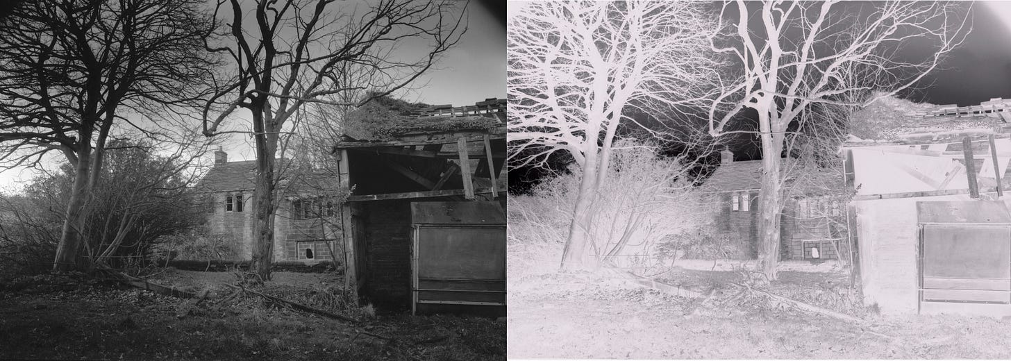 Two images side by side, one positive, one a direct inversion. If you point your phone at it and (assuming you can invert) and look at a negative version of it, you will see that the left and right images both look correct and are in an exact correlation with each other. This, you would assume is the perfect negative, but that is not really the case. If you are scanning and inverting you may find this density works, but if you are printing in the darkroom you will find that negative a too thin and it will print rather dark.