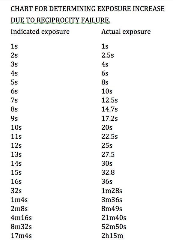 This linked relationship begins to slip away with exposures longer than one second, and the longer the indicated exposure, the more of a difference there is between the indicated exposure and what is actually needed. This is why it is referred to as Reciprocity Failure. This is the chart I have used for years: