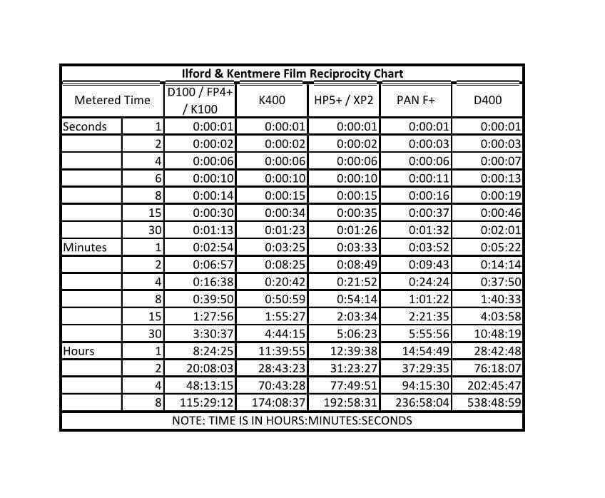 The Ilford information sheet can be downloaded from here: https://www.ilfordphoto.com/wp/wp-content/uploads/2024/05/Reciprocity-Failure-Compensation-v2.pdf