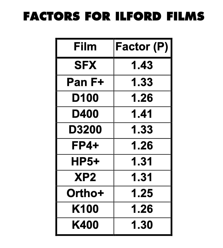 Ilford provide two methods of calculation, one is a list of multiplication factors: